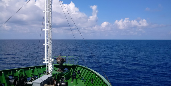 03.5.2014. Xung quanh tầu là biển. Biển cong khi nhìn từ boong tầu. Nếu lên đỉnh tầu - nơi cờ Tổ quốc đang tung bay, thì rõ ràng biển hình cầu.