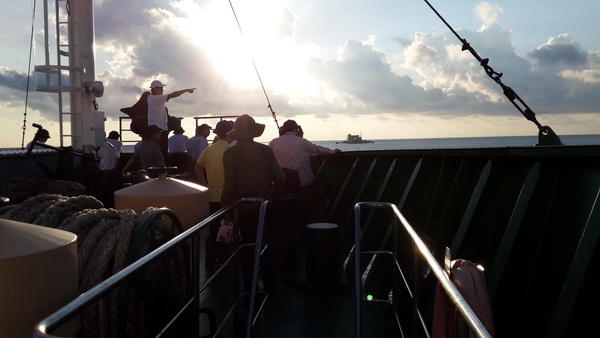 Mặc dù 4h30 phút mới có lệnh “Te. Te. Te... Toàn tầu báo thức!. Báo thức toàn tầu!”, từ 4h sáng trên boong dạo đã đầy người. Người thể dục, người ngắm bình minh trên biển. “Đảo Đá Lớn đây rồi” - mọi người đều hướng tầm mắt về mấy nơi sáng đèn đoán đâu là nơi chúng tôi sẽ được đến thăm đầu tiên.