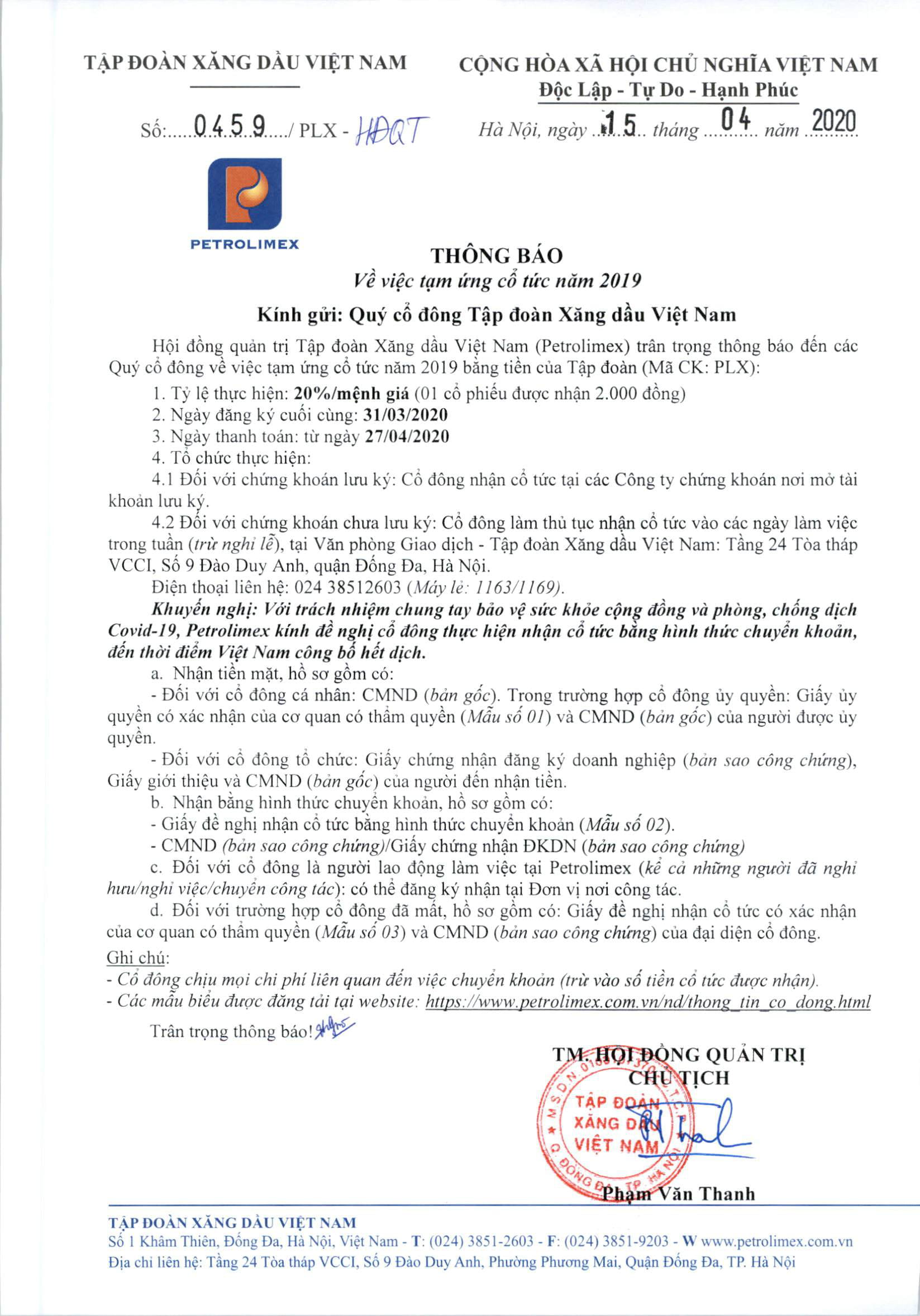 Thông báo về việc tạm ứng cổ tức năm 2019