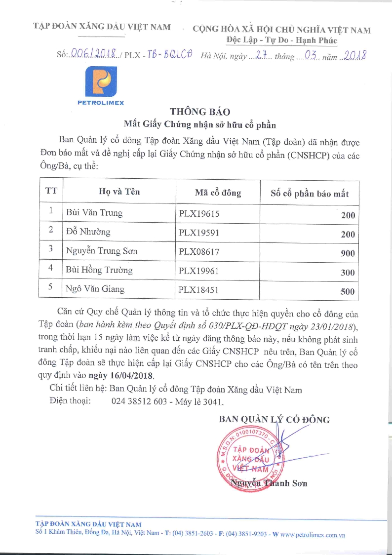 Danh sách chi tiết tạiThông báosố 006/2018/PLX-TB-BQLCĐ ngày 27.3.2018và các mẫu Đơn đề nghị cấp lại GCNSHCP & Giấy đề nghị hiệu chỉnh thông tin - để Quý vị Cổ đông thuận tiện trong tra cứu, sử dụng.