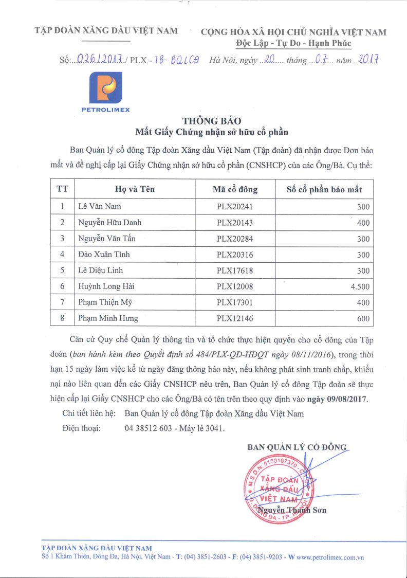 Danh sách chi tiết tạiThông báosố 026/2017/PLX-TB-BQLCĐ ngày 20.7.2017và các mẫu Đơn đề nghị cấp lại GCNSHCP & Giấy đề nghị hiệu chỉnh thông tin - để Quý vị Cổ đông thuận tiện trong tra cứu, sử dụng.